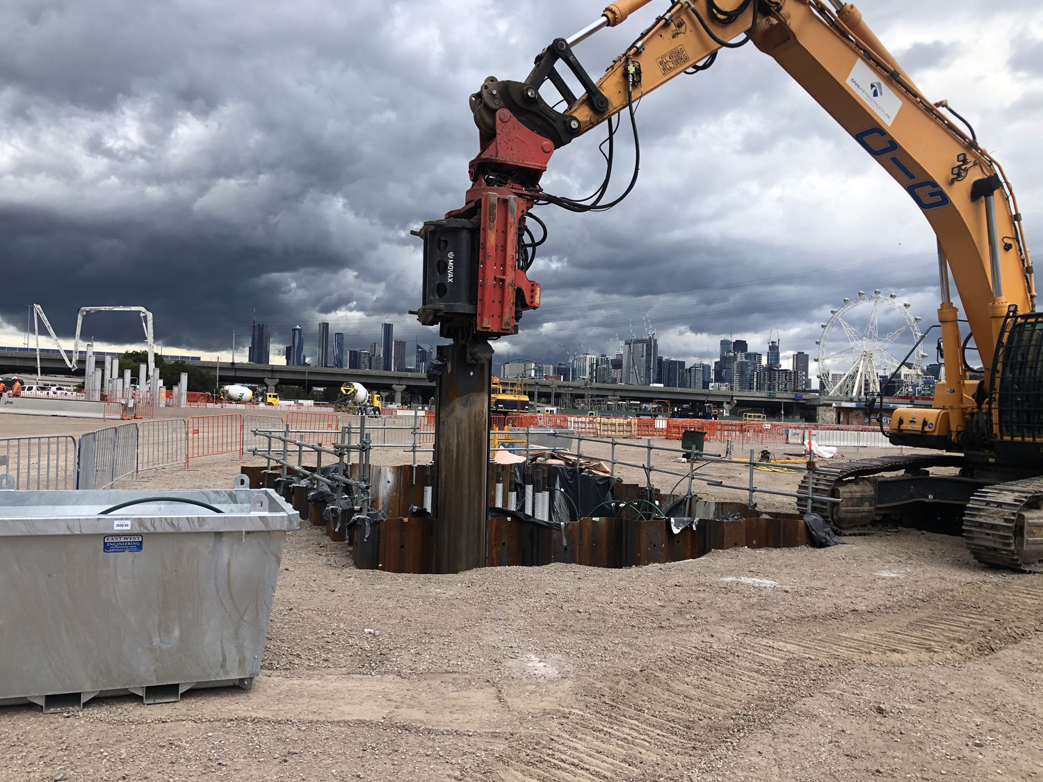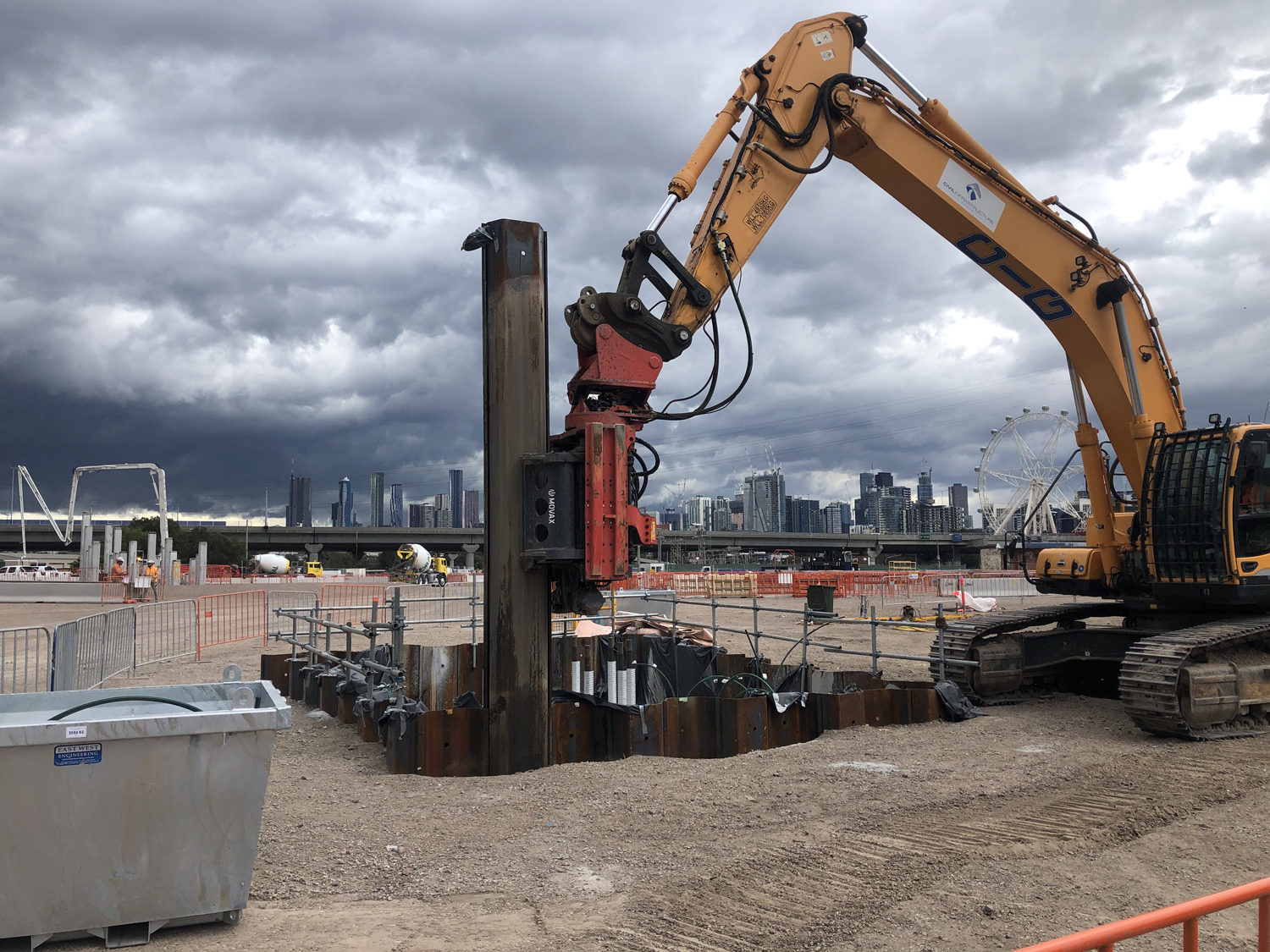 PRM have installed and commissioned a Movax SG-75V in Victoria. Designed to match the capabilities of larger excavators and to combine a robust structure with excellent pile handling characteristics this attachment is driving 12 metre sheets for coffer dams that will be excavated for driven pile caps and extraction after concrete is cast.